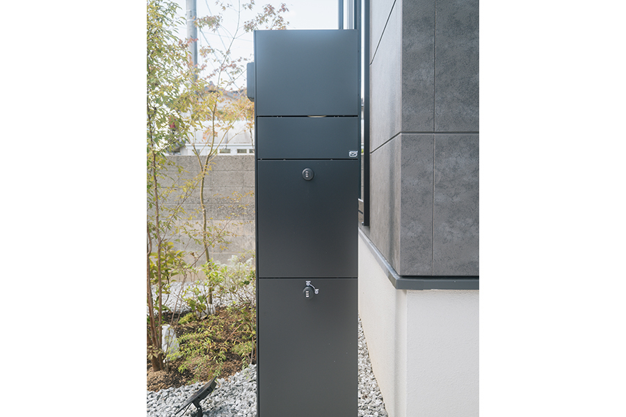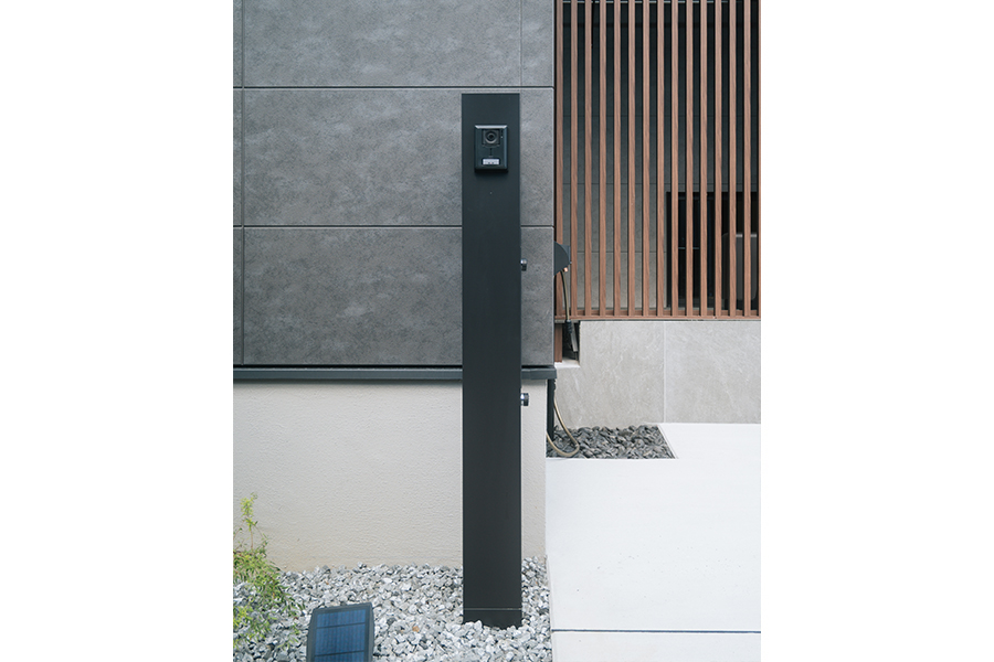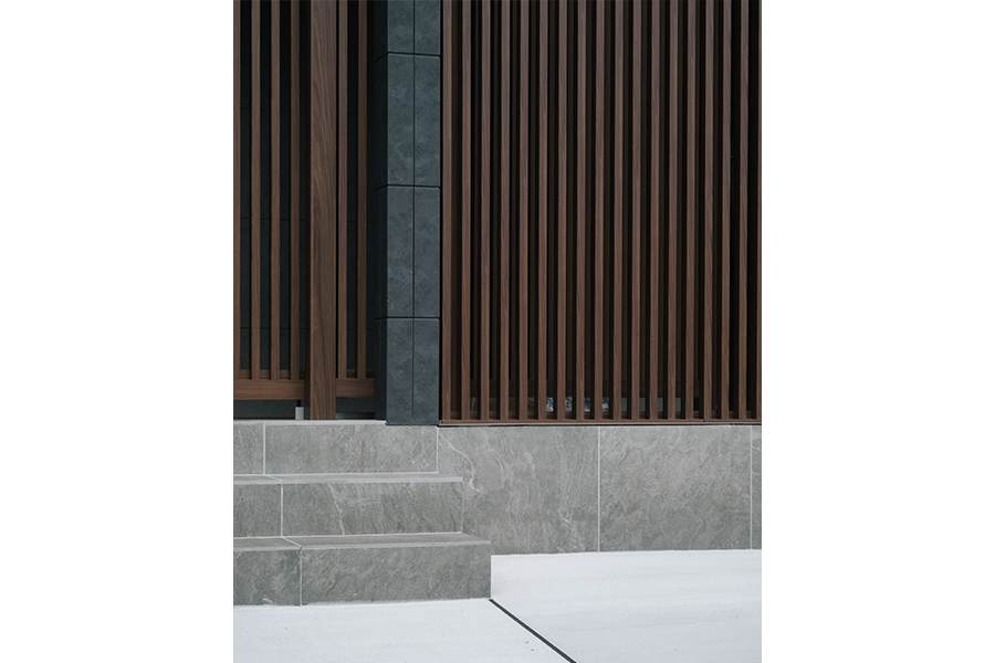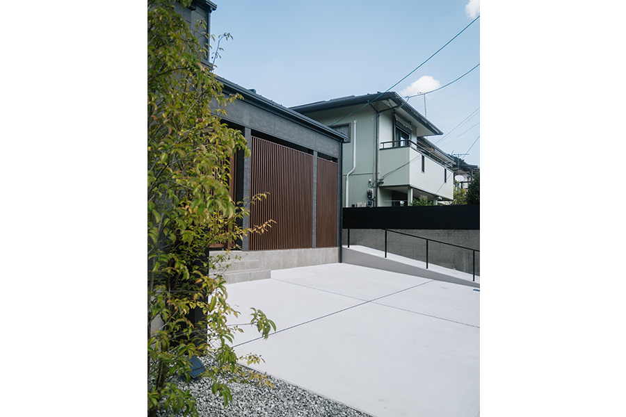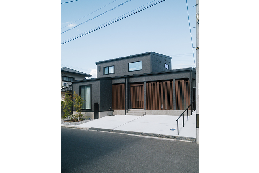 ダークグレーの外壁に、木調の縦格子を組み合わせた落ち着きのあるシックモダンスタイル。余白を活かし、素材の質感が引き立つ美しさを演出しています。建物の直線的なデザインをベースに、植栽の柔らかいグリーンが差し色として効かせる、上品で洗練された外構デザインです。